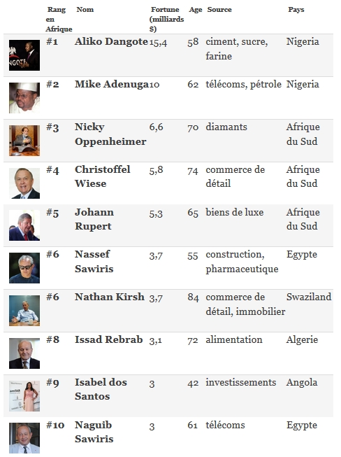 هذه القائمة شهدت تواجد العملاق المصري نجيب ساويريس , و الّذي يعدّ أحد أقطاب عالم تكنولوجيا الإتّصال و المعلومات في المنطقة العربيّة و الإفريقيّة . إذ هو رئيس شركة أوراسكوم للإتّصالات و التّكنولوجيا . و قد جاء في المركز العاشر بثروة قدّرت ب3 مليار دولار . و قد ظهر أخوه ناصيف ساويريس صاحب الأعمال الرّائدة في مجال الصّناعات الصّيدليّة , كذلك في التّرتيب محتلّا المركز السّادس ب3.7 مليار دولار .