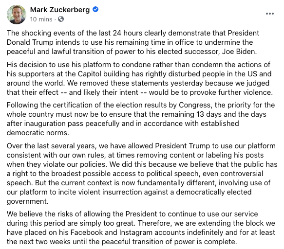 أعلن مؤسس فايسبوك مارك زوكربورغ عبر تدوينة له على الموقع أنه سيقع حظر حساب الرئيس الأمريكي دونالد ترامب على منصتي فايسبوك وإنستغرام إلى أجل غير مسمى، وذلك على خلفية هجمات انصار ترامب على مبنى الكابيتول.