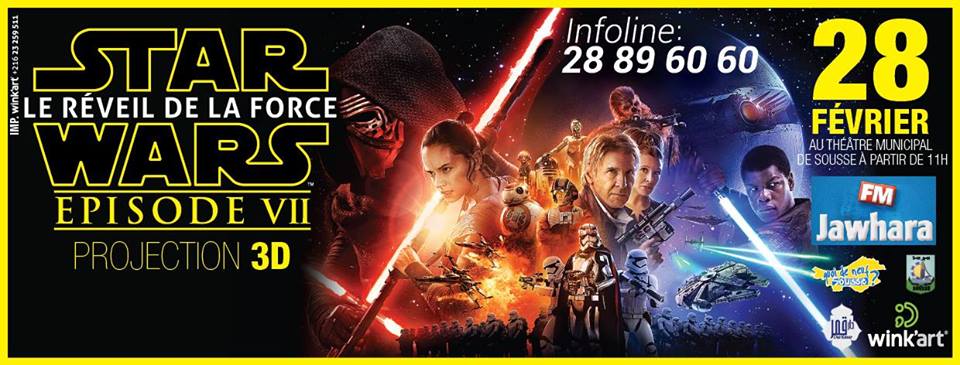 إذن ، سيكون لعشّاق السّلسلة و لمحبّي التّكنولوجيات الحديثة إمكانيّة الفوز بمجموعة من الدّعوات الخاصّة لحضور عرض ثلاثي الأبعاد ( 3D ) لفيلم حرب النّجوم الجديد ، و ذلك يوم الأحد 28 فيفري المقبل بالمسرح البلدي بسوسة ٠