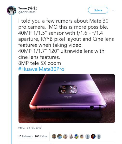 كما أشار التقرير إلى أن وحدة كاميرا هاتف هواوي Mate 30 ستتألف من مستشعر رئيسي بدقة 40MP ومن عدسة ذات زاوية فوق موسعة بدقة 40MP إلى جانب عدسة تكبير بقيمة 5 أضعاف (5X) وبدقة 8MP. أما التقارير السابقة ، فتفيد بأن هاتف Mate 30 سينطوي على معالج من نوع Kirin 985 وسيدعم تقنية الشحن السريع بقوة 55 وات وتقنية الشحن اللاسلكي بقوة 10 وات.