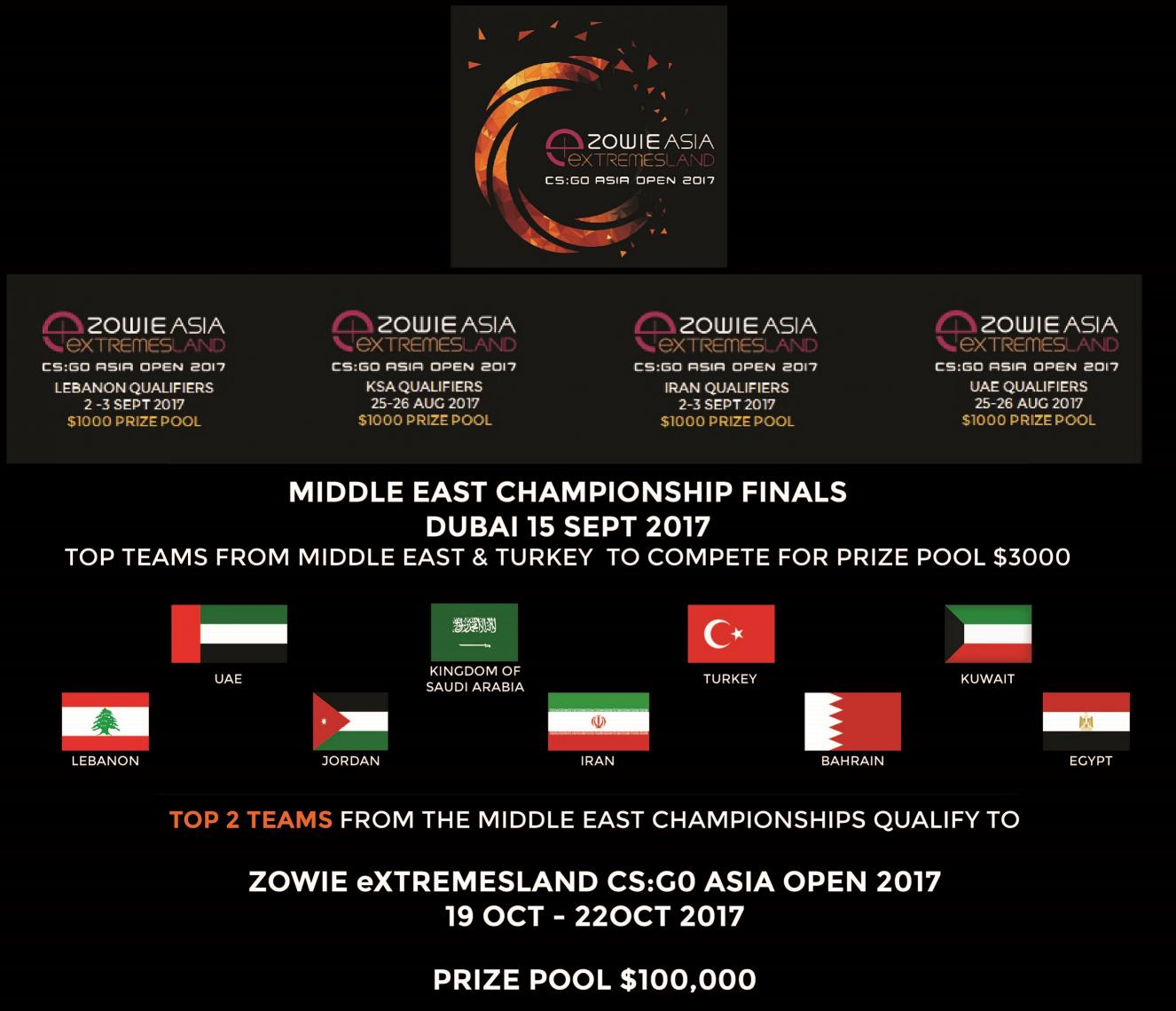 وستستضيف الإمارات العربية المتحدة والمملكة العربية السعودية الجولة الأولى من تصفيات اللعبة على الشبكة المحلية يومي الخامس والعشرون والسادس والعشرون من أغسطس، تليها لبنان في الثاني والثالث من سبتمبر ثم إيران (يتم تحديد التاريخ). وسيتم دعوة أفضل الفرق من دول الشرق الأوسط الأخرى، وكذلك من البحرين ومصر والأردن والكويت وتركيا للمنافسة في المرحلة الثانية، والتنافس على المباراة النهائية وكذلك للحصول على الجائزة الإجمالية التي تبلغ 3000 دولار أمريكي. وسيتم ذلك في الخامس عشر من سبتمبر في دبي. سيتأهل أفضل فريقان من بطولة الشرق الأوسط إلى زوي إكستريم لاند كاونتر سترايك: لعبة الفيديو جلوبال أوفينسيف آسيا المفتوحة 2017 من التاسع عشر إلى الثاني والعشرين من أكتوبر 2017 حيث تقدر القيمة الإجمالية للجائزة بـ 100,000 دولار أمريكي كجائزة كبرى لمن يتمكن من الفوز بها.