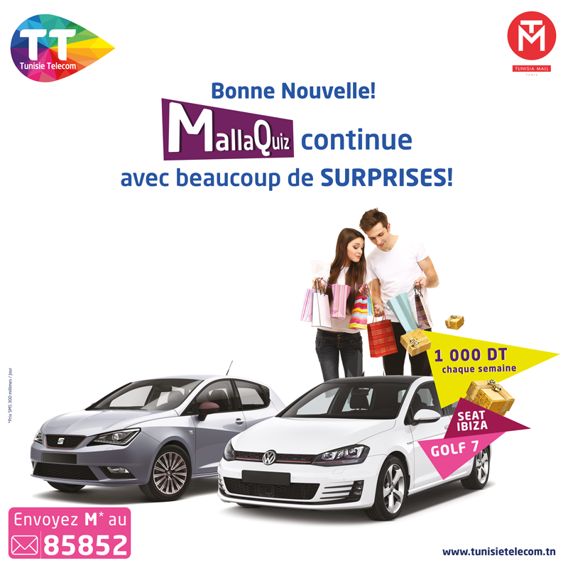 لعبة “Malla Quiz” تمكّن من ربح مبالغ ماليّة أسبوعيّا بقيمة 1000 دينار . أمّا الجائزة الكبرى فتتمثّل في سيّارة من نوع Golf 7. و تتمّ المشاركة عبر إرسال رسالة قصيرة (SMS) تتضمّن حرف “M” إلى الرّقم 85852.