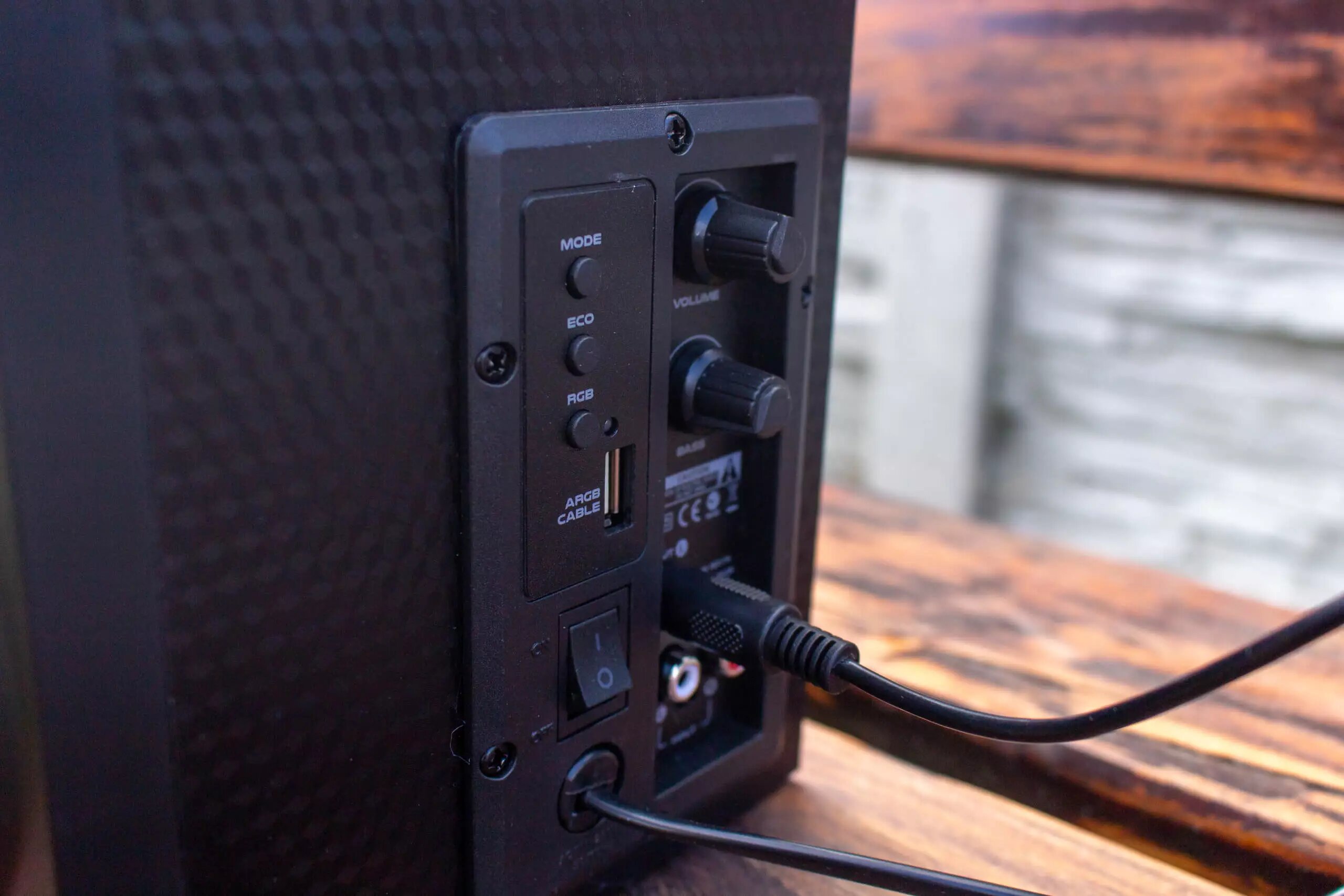تأتي وحدة التحكم في شكل مستطيل بالجانب الأيمن من المكبر الأيمن و تحتوي على ثلاثة أزار للتشغيل وضبط الإضاءة والألوان بجانبها عجلتين لتعديل مستوى الصوت و في الأخير تجد منافذ USB لوصل المكبرين بالحاسوب و إضافة مايكروفون..