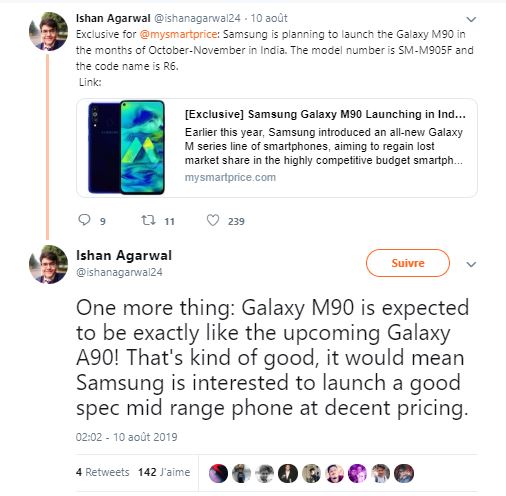 يشير منشور كان قد شاركه المسرب الهندي “إيشان أغاروال” على صفحته الرسمية على موقع تويتر إلى أن شركة تعمل على تطوير هاتفها Galaxy M90 الذي يرجح اطلاقه بين شهري أكتوبر و نوفمبر.