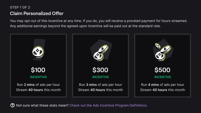 سيتلقى المرسلون المؤهلون أو الشركاء المؤهلون إشعارا من Twitch يقدم لهم دفعات مختلفة بناءا على مقدار الإعلانات التي يتم عرضها في الساعة وإجمالي ساعات البث. في المثال الذي قدمته Twitch، إذا قام صانع المحتوى بالبث لمدة 40 ساعة على الأقل في ذلك الشهر فيمكنه الحصول على 100 دولار مقابل تشغيل دقيقتين من الإعلانات في الساعة أو 300 دولار لمدة ثلاث دقائق أو 500 دولار لمدة أربع دقائق.