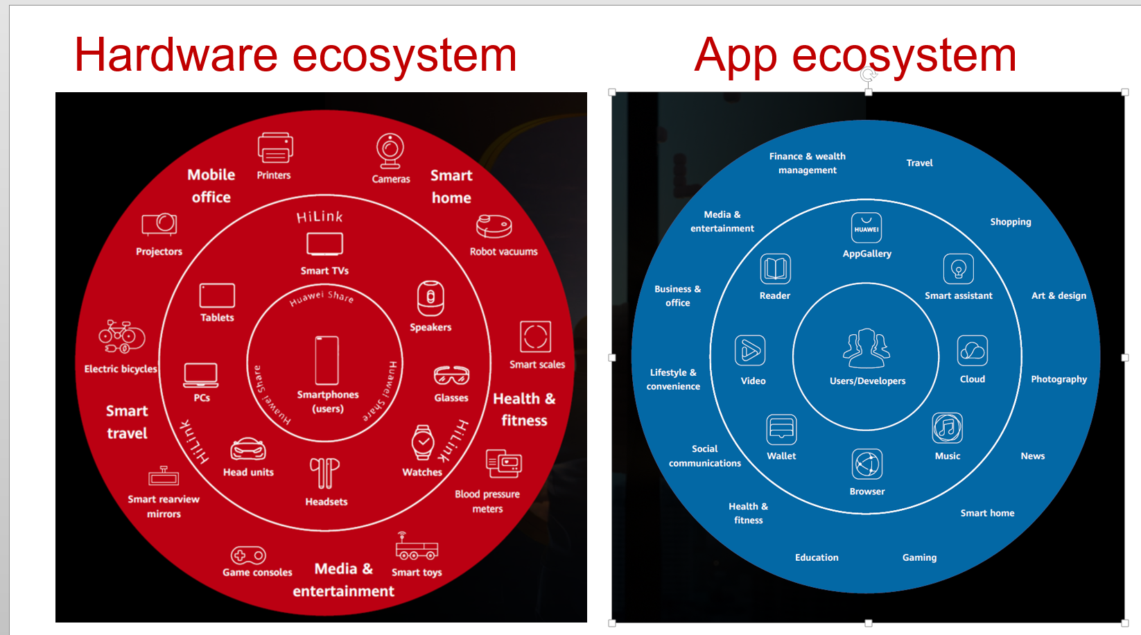 يحافظ النظام البيئي 1 + 8 + N على الهاتف الذكي في مركزه كنقطة دخول للمستهلكين. يرتبط هذا بثماني فئات من الأجهزة الذكية لسيناريوهات مختلفة – أجهزة الحواسيب والأجهزة اللوحية وأجهزة التلفزيون الذكية وأجهزة الصوت والنظارات الذكية والساعات الذكية والسيارات (تقنيات المعلومات) وسماعات الأذن. يشير حرف “N” إلى الطبقة التي يلتقي فيها كل شيء معًا ويشير إلى آلاف الأجهزة التي تدعم إنترنت الأشياء والتي يمكن توصيلها بسلاسة. تمثل “+” تقنيتي Huawei Share و HiLink، اللاتي يجعلن هذا الاتصال سهلا.