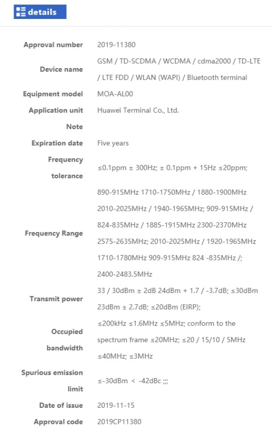 ووفقا لموقع وزارة الصناعة وتكنولوجيا المعلومات، فإن هاتف العلامة التجارية Honor الحامل لرقم الموديل MOA-AL00 والبالغ من الأبعاد 159.07 ملم × 74.06 ملم × 9.04 ملم سيأتي مع شاشة Waterdrop بحجم 6.3 إنش ومع بطارية بقوة 4900mAh.