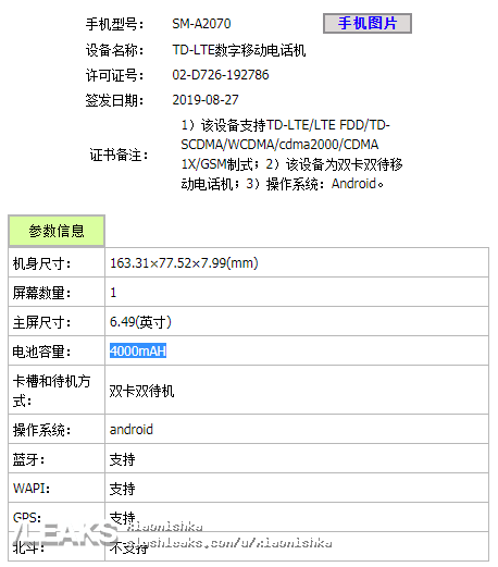 لاح الأمس هاتف سامسونج Galaxy A20s على موقع هيئة الإتصالات الصينية TENAA التي كشفت عن مواصفاته الرئيسية. ووفقا للموقع، فإن هاتف سامسونج الذي يحمل رقم الموديل SM-A2070 سيأتي مع شاشة Infinity-V بحجم 6.4 إنش مجهزا بماسح بصمات أصابع خلفي.