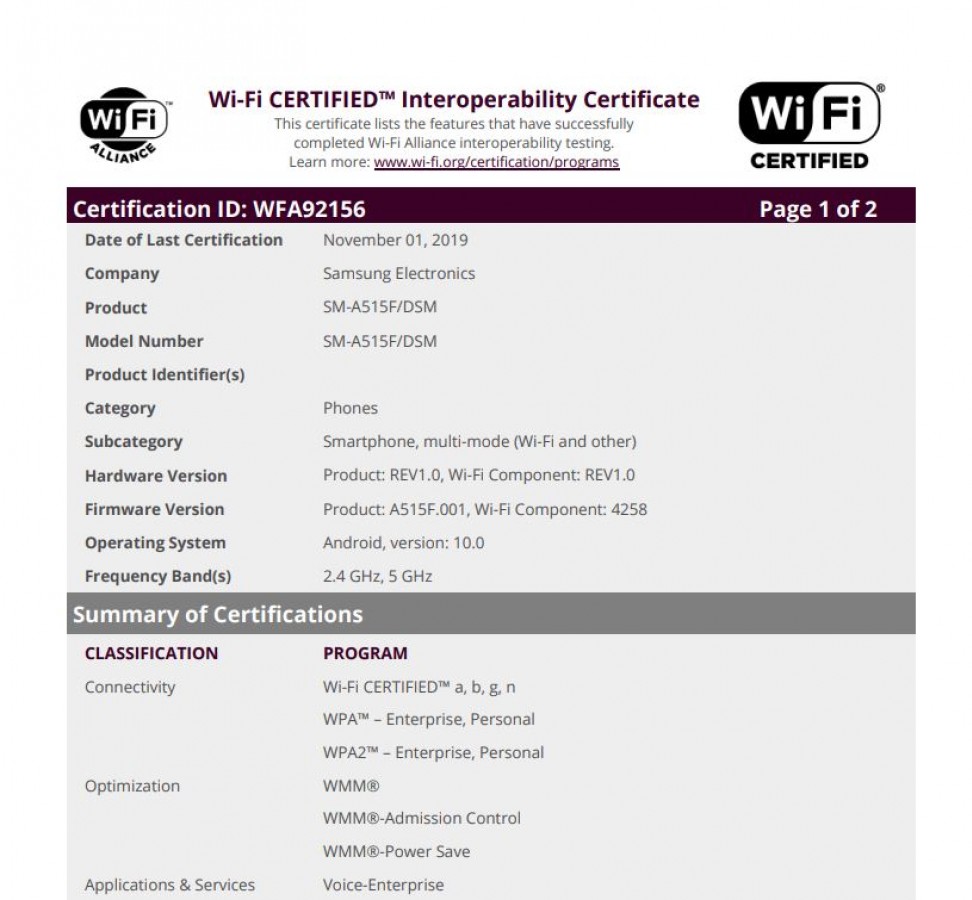 لاح اليوم هاتف سامسونج Galaxy A51 على موقع Wi-Fi Alliance الذي كشف على أن الهاتف الحامل لرقم الموديل SM-A515F سيدعم ميزة Wi-Fi مزدوجة النطاق وسيعمل بنظام التشغيل Android 10.