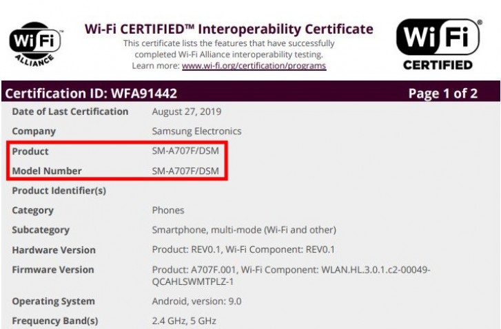 لاح بالأمس هاتف سامسونج Galaxy A70s الحامل لرقم الموديل SM-A707F على موقع WiFi Alliance مؤكدا على إقتراب موعد اطلاقه.