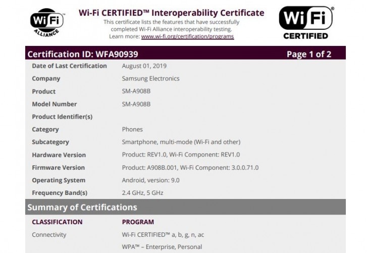 لاح بالأمس هاتف سامسونج Galaxy A90 5G الحامل لرقم الموديل SM-A908B على موقع WiFi Alliance الذي كشف على أن الهاتف سيعمل بنظام التشغيل Android 9 Pie وسيدعم تقنية WiFi 802.11 ac مزدوجة التردد.