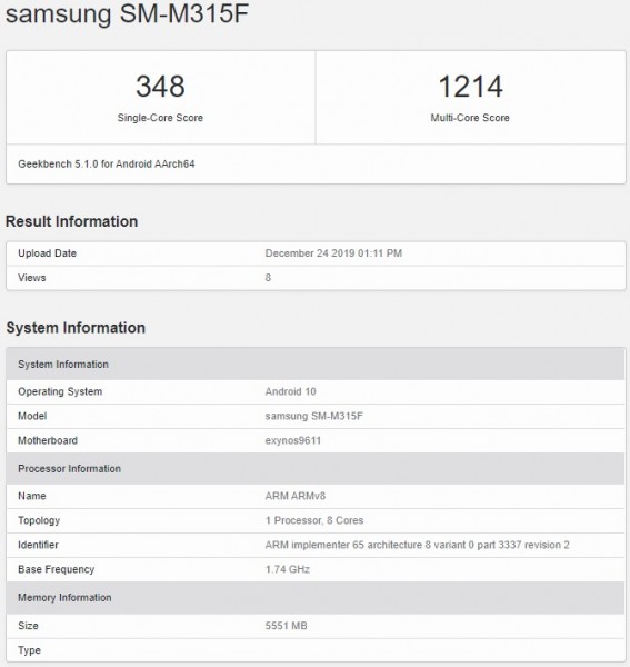 ووفقا للمنصة، فإن هاتف سامسونج Galaxy M31 الحامل لرقم الموديل SM-M315F قد سجل مجموع نقاط بلغت 348 نقطة للنواة الواحدة و 1214 نقطة للنواة المتعددة. كما كشفت المنصة على أن الهاتف سينطوي على معالج من نوع Exynos 9611 وعلى ذاكرة وصول عشوائي بسعة 6GB فضلا عن عمله بنظام التشغيل Android 10.