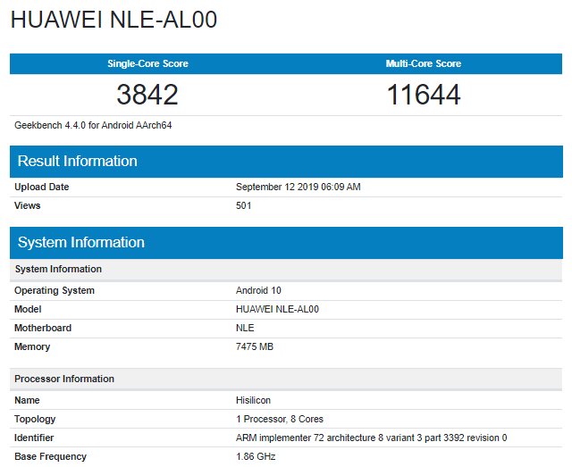 ووفقا للمنصة ،فإن هاتف هواوي المجهول قد سجل مجموع نقاط بلغت 3842 نقطة للنواة الواحدة و 11644 نقطة للنواة المتعددة. كما كشفت المنصة على أن الهاتف سينطوي على معالج من نوع Kirin 990 وعلى ذاكرة وصول عشوائي بسعة 8GB فضلا عن عمله بنظام التشغيل Android 10. وفي الوقت الذي يدعي فيه البعض بأن رقم الموديل NLE-AL00 هو ليس رقم موديل كل من هاتفي هواوي Mate 30 و Mate 30 Pro المقرر الاعلان عنهما بعد أيام قليلة ، فإن البعض الأخر يرجح أن يكون رقم الموديل هذا رقم موديل هاتف Honor V30 الذي تأكد رسميا انطوائه على معالج Kirin 990 الجديد أو أن يكون رقم موديل هذا رقم موديل هاتف هواوي Mate 30 X المرتقب خاصة وأن هواوي قد اطلقت العام الماضي هاتفها Mate 20X الذي كان أول هاتف ينطوي على المعالج من نوع Kirin 980.