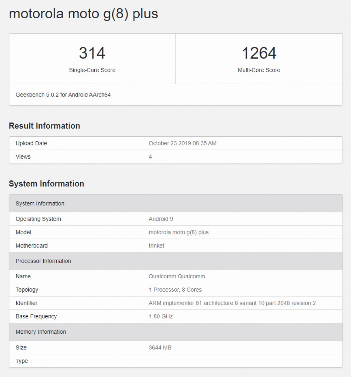 ووفقا للمنصة (Geekbench 5) ،فإن هاتف Moto G8 Plus قد سجل مجموع نقاط بلغت 314 نقطة للنواة الواحدة و 1264 نقطة للنواة المتعددة. كما كشفت المنصة على أن الهاتف سينطوي على معالج من نوع Snapdragon 665 وعلى ذاكرة وصول عشوائي بسعة 4GB فضلا عن عمله بنظام التشغيل Android Pie. أما التخمينات، فترجح أن يأتي الهاتف مع شاشة LCD بحجم 6.3 إنش وبدقة 1080 بيكسل إلى جانب بطارية بقوة 4000mAh ووحدة كاميرا خلفية رباعية.