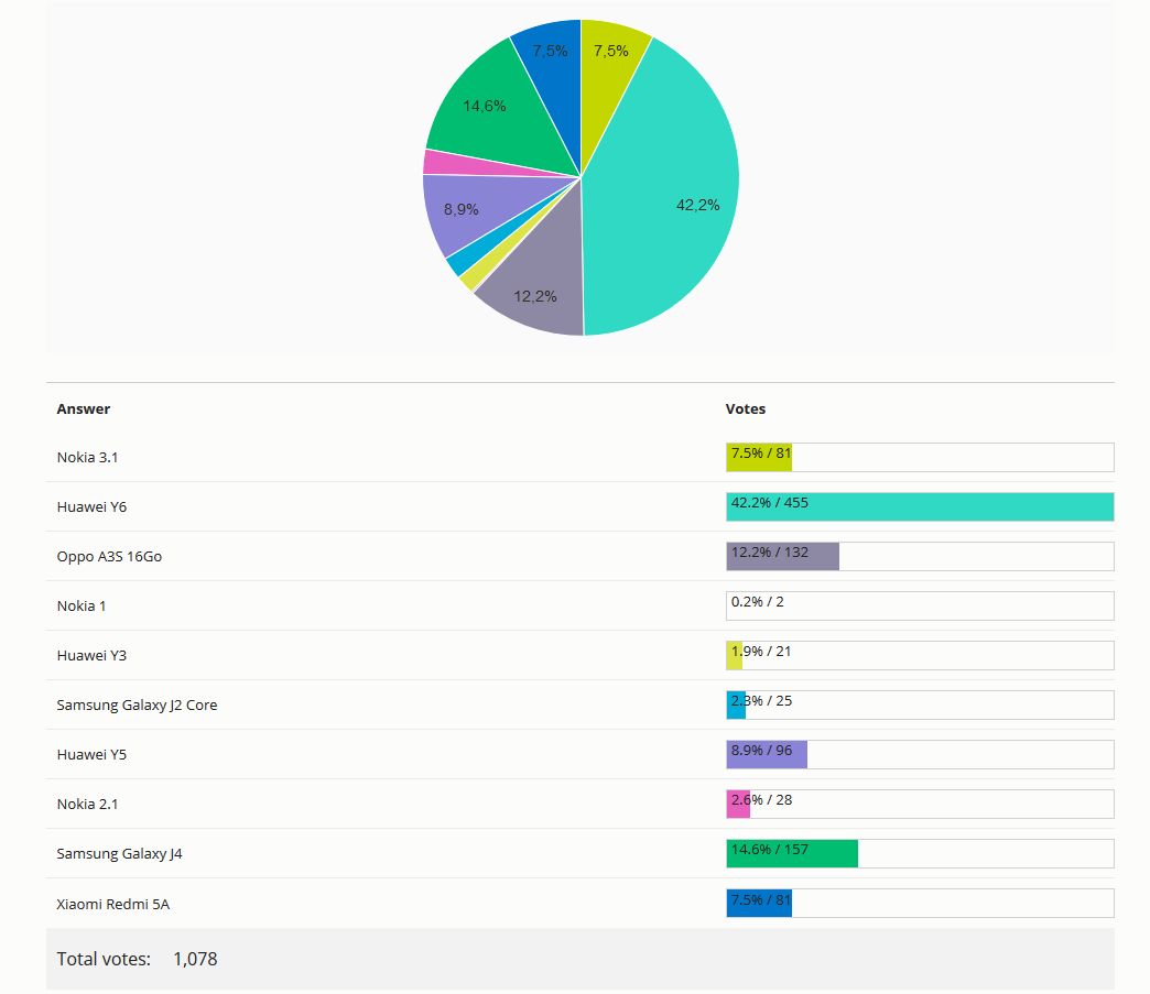 الهاتف الذّكيّ Huawei Y6 حقّق نصيب الأسد, بنسبة تصويت بلغت 42,2 % (455 صوت), متقدّما بفارق هامّ للغاية, عن صاحب المركز الثّاني, هاتف Galaxy J4 من علامة Samsung. و هذا دون نسيان حضور علامة Oppo مرّة أخرى , بإحتلالها المرتبة الثّالثة في تصنيف الهواتف ذات السّعر الأقلّ من 500 دينار , من خلال هاتفها A3S 16Go .