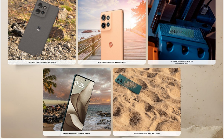 تطلق Motorola على هذا الهاتف لقب “أنحف هاتف في العالم حاصل على شهادة MIL-STD-810H من الدرجة العسكرية”، على الرغم من أننا لم نر السُمك بعد. لقد تم اختباره ضد السقوط والاهتزاز ودرجات الحرارة القصوى (العالية والمنخفضة) وضباب الملح. كما أنه حاصل على تصنيف IP68 وله إطار معدني (لا توجد أي معلومات عن الزجاج حتى الآن).