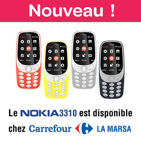 بعد أن أعلن مشغّل الإتّصالات أوريدو تونس منذ فترة قصيرة, عن توفّر منتوج Nokia 3310 في صيغته العالميّة الجديدة, رسميّا,للبيع على موقعه الإلكترونيّ الرّسمي, ها أنّ الفضاء التّجاري الضّخم Carrefour Tunisie , يعلن منذ سويعات قليلة عن توفّر الهاتف الجديد في فرعه بالضّاحية الشّمالية بالمرسى.