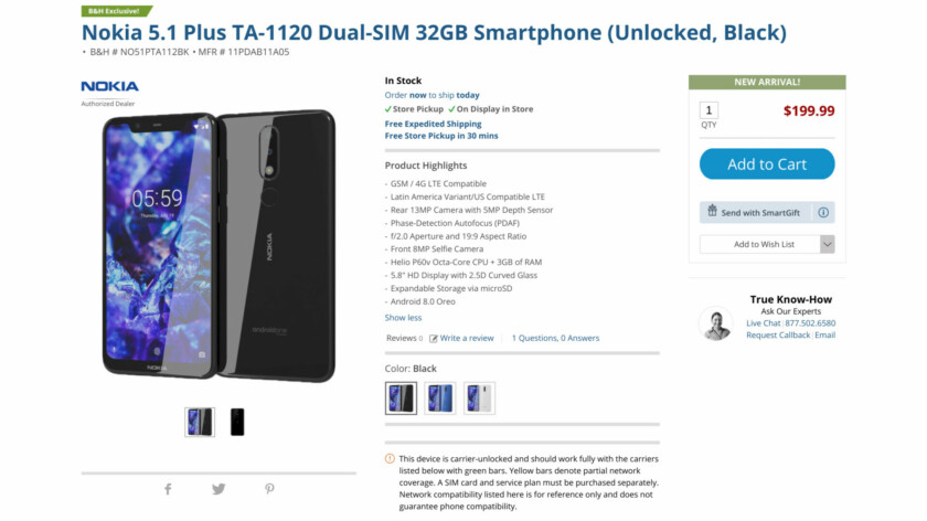 إذا كنت تعيش في الولايات المتحدة الأمريكية وتبحث عن هاتف ذو سعر ميسور فقد تجد ما تبحث عنه في هاتف Nokia 5.1 Plus الذي يتوفر الآن على موقع B&H مقابل 199 دولارا (أي 611 دينارا).