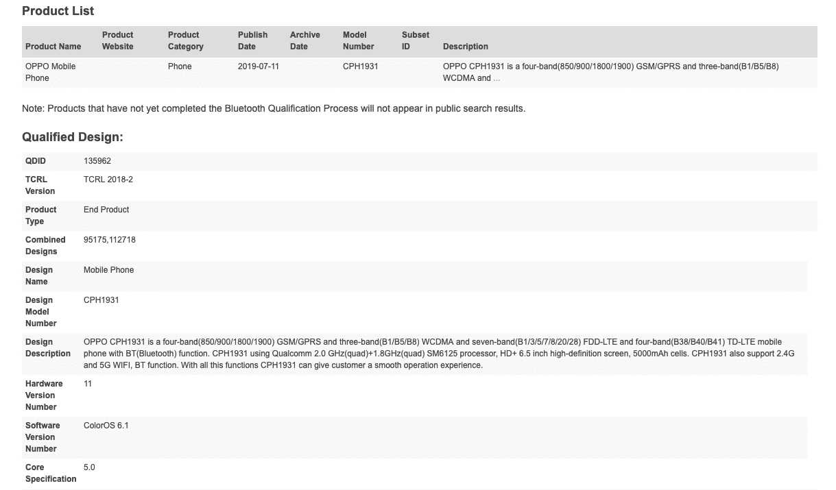 لاح اليوم هاتف جديد من شركة OPPO المصنعة للهواتف الذكية على موقع Bluetooth SIG التي كشفت عن مواصفاته الرئيسية. ووفقا لموقع Bluetooth SIG ، فإن هاتف OPPO الحامل لرقم الموديل CPH1931 سيكون مجهزا بأحدث معالج من شركة Qualcomm من نوع Snapdragon 665 الذي كان قد أعلن عنه في شهر آفريل الماضي.