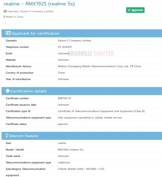 وعلى الرغم من عدم توفر أي معلومات حوله، إلا أن هاتف Realme 5S الحامل لرقم الموديل RMX1925 قد تحصل اليوم على موافقتي كل من مكتب NBTC التايلندي و BIS الهندي مشيرا إلى إقتراب موعد الاعلان عنه.