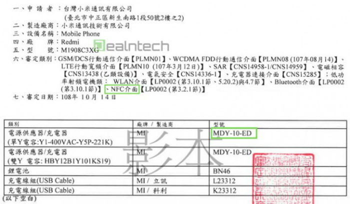تشير شهادة موافقة ممنوحة من طرف اللجنة الوطنية للاتصالات لجمهورية الصين في تايوان إلى أن هاتف Redmi Note 8T الحامل لرقم الموديل MDY-10-ED سيدعم كلا من تقنية الشحن السريع بقوة 18 وات وتقنية التواصل قريب المدى NFC.