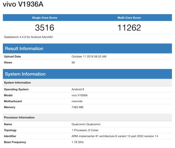 ووفقا للمنصة ،فإن الهاتف الحامل لرقم الموديل V1936A والذي يعتقد بأنه هاتف VIVO iQOO Neo 2 قد سجل مجموع نقاط بلغت 3516 نقطة للنواة الواحدة و 11262 نقطة للنواة المتعددة. كما كشفت المنصة قيس الأداء على أن هاتف سينطوي على ذاكرة وصول عشوائي بسعة 8GB وسيكون مجهزا بمعالج ثماني النوى من شركة Qualcomm من نوع Snapdragon 855.