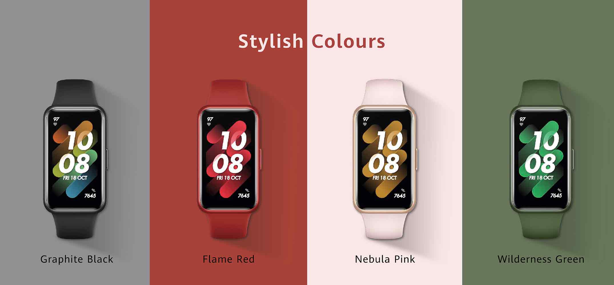يبرز سوار HUAWEI Band 7 بين منافسيه، ويوفر وظائف احترافية في مجال الصحة العلمية واللياقة البدنية. يتميز السوار بأنحف جهاز تعقب للياقة البدنية بسماكة أقل من 10 ملم ويزن 16 جرامًا[10]. مزود بشاشة AMOLED مع نسبة شاشة إلى جسم تبلغ 64.88٪[11] ودقة عرض 194 × 368 التي توفر محتوى ومرئيات نابضة بالحياة. يمكن للمستخدمين تخصيص وجه ساعتهم بألوان مختلفة لتتناسب مع ملابسهم.