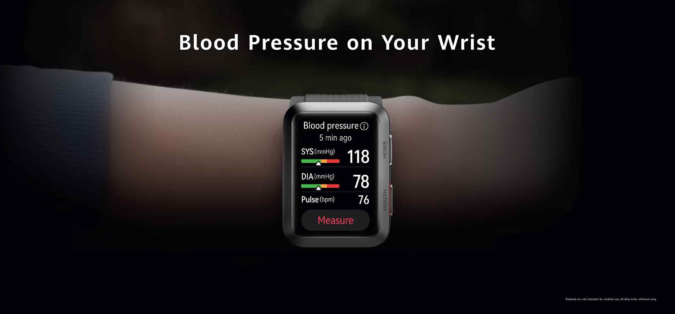 ساعة HUAWEI WATCH D هي أول جهاز لمراقبة ضغط الدم[14] من المعصم يوفر قياسًا دقيقًا لضغط الدم في أي وقت وفي أي مكان لمرضى ارتفاع ضغط الدم.