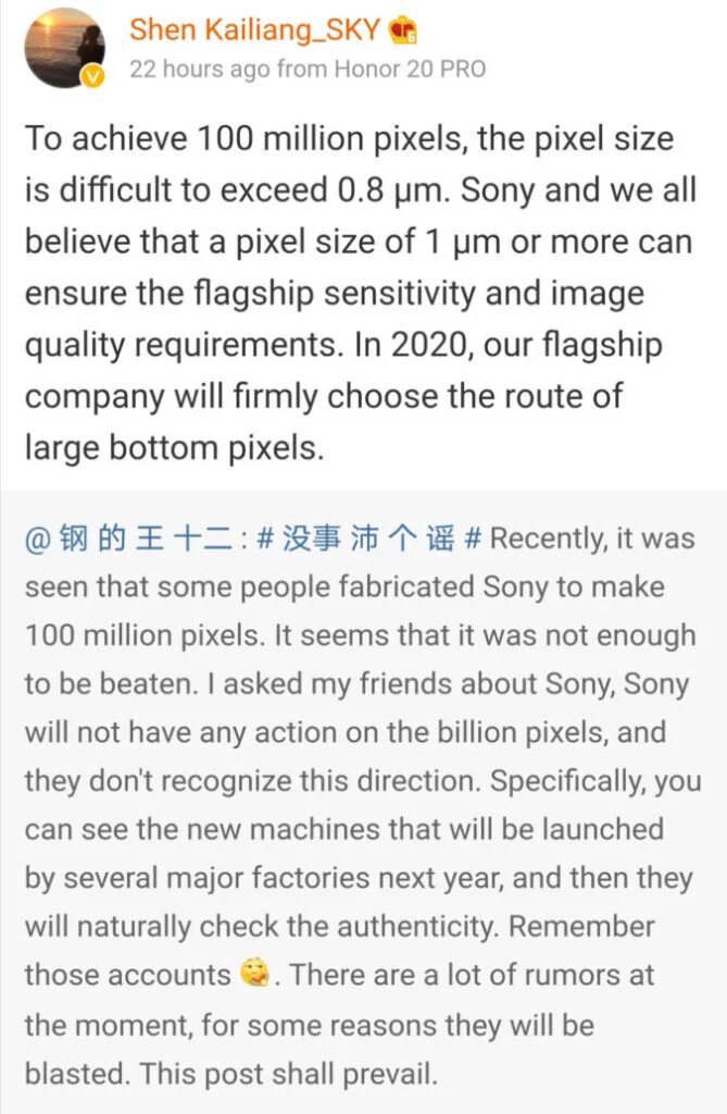 كما قالت العلامة التجارية Honor على لسان مديرها التسويقي بأن الإعلان عن مثل هذه الهواتف يستلزم الحفاظ على قياس بكسيلات بحجم 0.8μm وهو أمر يتعارض مع حقيقة أن أصغر بيكسلات قادرة على ضمان جودة الصورة تبلغ من الحجم 1μm. ومن جهته صرح “كايليانغ شين” بأن العلامة التجارية Honor قد اختارت سلك الطريق نحو بيكسلات أكبر حجما بدل إتباع النهج المؤدي إلى درجة استبانة عليا.