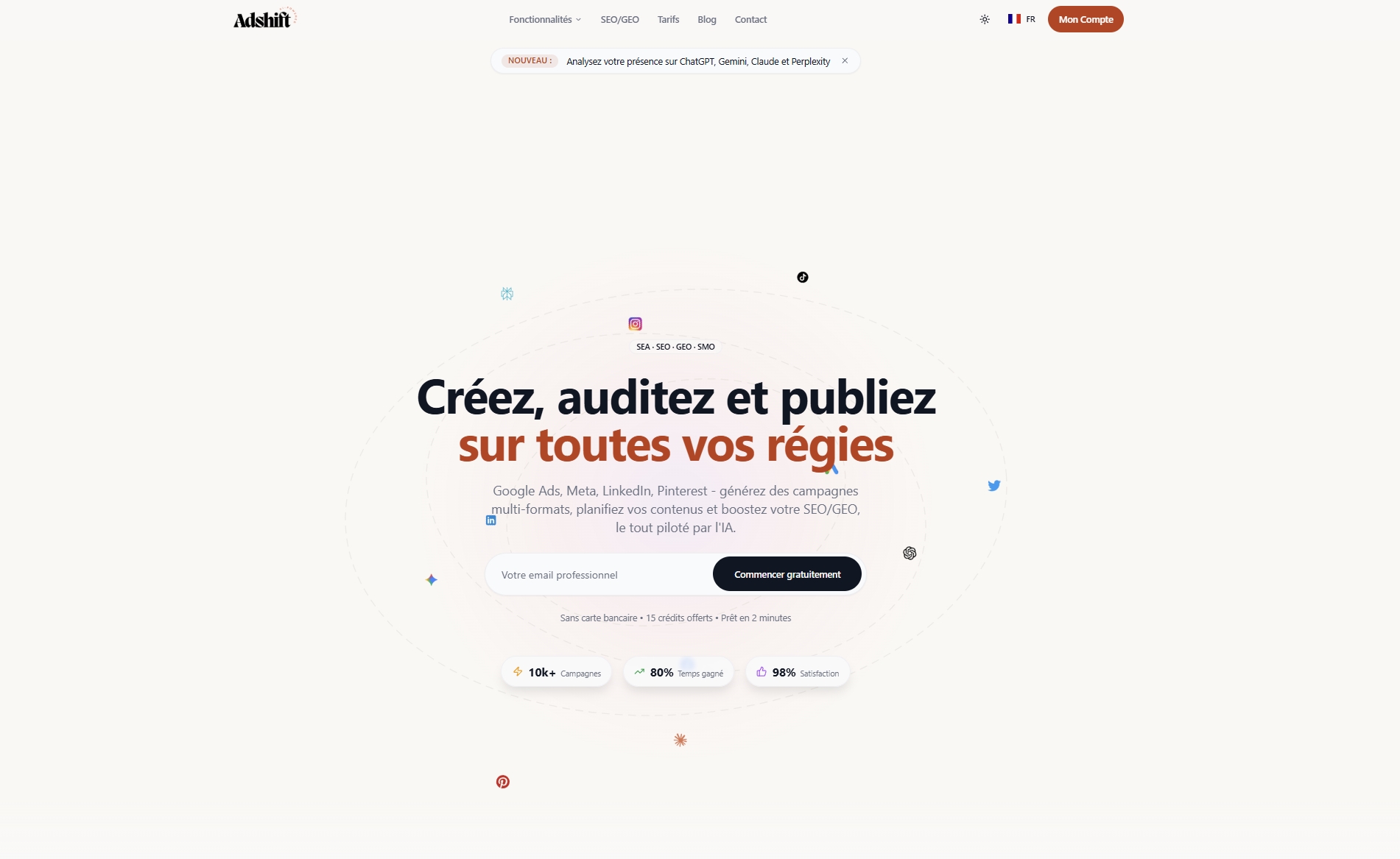 AdShift هي منصة متكاملة (All-in-One) تعتمد على الذكاء الاصطناعي لم مساعدة الشركات على إنشاء، تدقيق، وتحسين حملاتها التسويقية عبر قنوات متعددة مثل Google Ads، Meta (Facebook & Instagram)، LinkedIn، وPinterest، بالإضافة إلى أدوات متطورة لتحسين الظهور في محركات البحث.