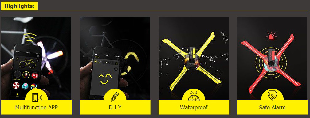 تقدّم Balight إذن نماذج مختلفة لتحميلها أو لإنشائها عن طريق تطبيقة خاصّة بعجلات الدّرّاجة . النّظام الّذي يلتحم بأربعة أطياف ( rayons ) , يتكوّن من 376 صمّام ثنائي باعث للضّوء ( LED ) تمكّن من تحويل 16 مليون لون , و النّتيجة لن تكون إلّا مثاليّة بالتّأكيد .