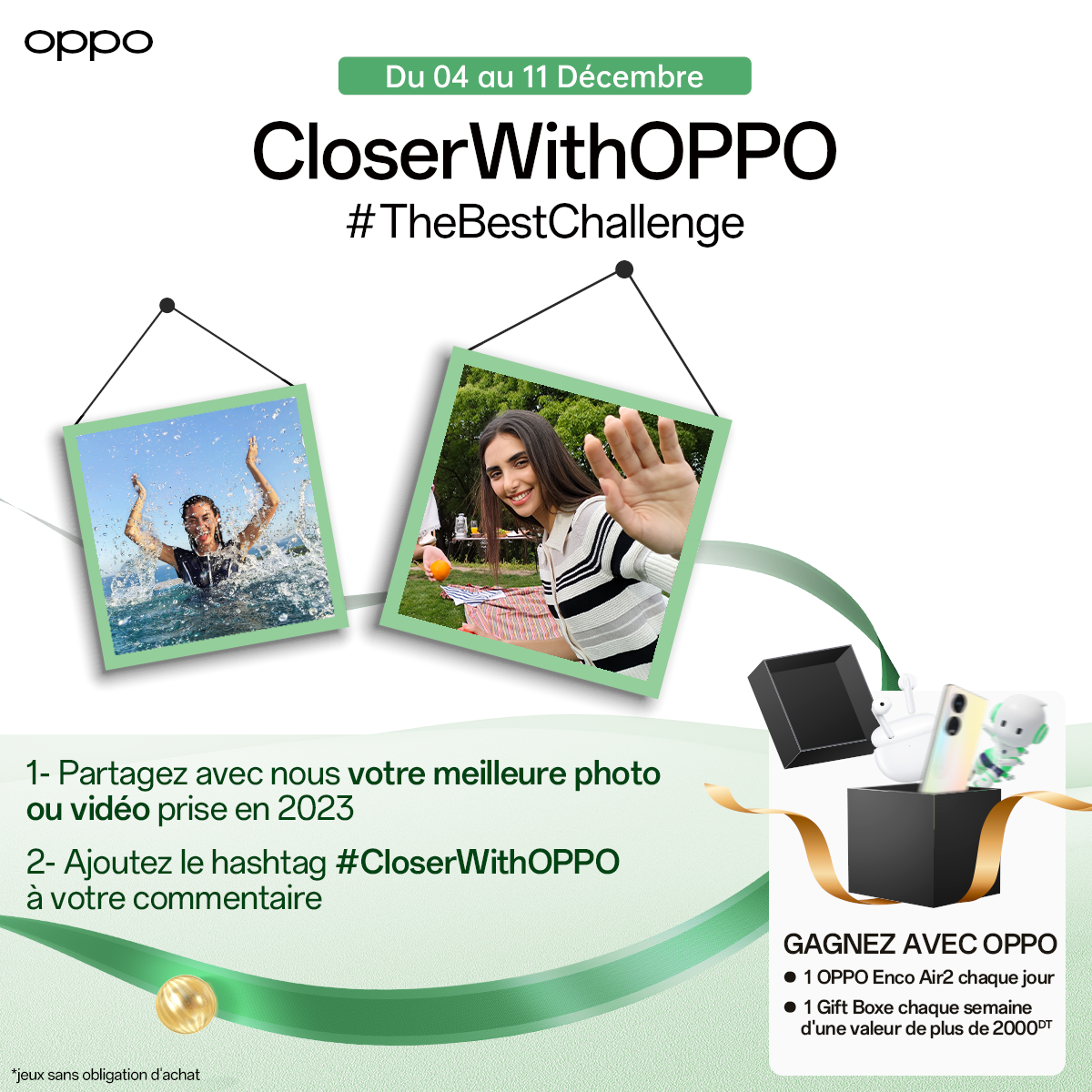 فعلى صفحة الفايسبوكhttps://www.facebook.com/OPPOTunisia تمّ دعوة المعجبين لنشر أفضل الصور ومقاطع الفيديو التي تمّ التقاطها سنة 2023، مع إضافة الهاشتاغ CloserWithOPPO# في التّعليقات. وسيمكّن ذلك من الفوز يوميّا بسمّاعة أذن لاسلكيّة ENCO AIR 2 لصاحب أو صاحبة الحظّ، بينما يتمّ في نهاية كلّ أسبوع (خلال شهر ديسمبر الحالي) منح جائزة كبرى مميّزة بقيمة 2000 دينار، تشمل هاتف Reno8T 5G، وسمّاعة ENCO BUDS وتمثال OLLY من OPPO مع قبّعة وحلقة مفاتيح وقميص رياضيّ UEFA.