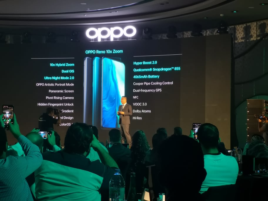 وللتذكير، فإن هاتف Oppo Reno 10X Zoom Edition يأتي مع كاميرا مئفاقية بدقة 13MP ذات فتحة عدسة f/3.0 ومع تقنية تكبير 10 أضعاف. كما تنطوي وحدة الكاميرا أيضا على مستشعر رئيسي بدقة 48MP مع فتحة عدسة f/1.7 وعلى كاميرا ذات زاوية موسعة (120°) بدقة 8MP. كما يحتوي الهاتف على كاميرا أمامية مبتكرة بدقة 16MP مع فتحة عدسة f/2.0 هي الأولى من نوعها ، حيث تتخذ هذه الكاميرا شكل المثلث عند انبثاقها. يضاف إلى ذلك أن الهاتف مجهز بمعالج من نوع Snapdragon 855 ويتوفر بخياري ذاكرة وصول عشوائي إما بسعة 6GB أو بسعة 8GB وخياري ذاكرة تخزين داخلي إما بسعة 128GB أو بسعة 256GB. زد على ذلك أن الهاتف يأتي مع شاشة AMOLED عالية الدقة والوضوح بحجم 6.6 إنش دون أي ثلمة أو فتحة عند الزاوية إلى جانب عمله بنظام التشغيل Android Pie القائم بالأساس على واجهة المستخدم ColorOS 6. يضاف إلى ذلك أن الهاتف مجهز بماسح بصمات أصابع داخل الشاشة وببطارية بقوة 4065mAh داعمة لميزة الشحن السريع VOOC 3.0.